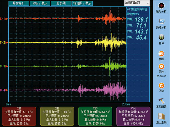 3、強(qiáng)大的振動信號分析功能,包括:加速度峰峰值、加速度有效值、有效平均速度、位移、振動主頻、時(shí)頻、頻譜分析等,并利用小波、SVM算法實(shí)現(xiàn)振動信號功率、能量的異常變化分析,并可進(jìn)行振動源位置分析,以及變壓器內(nèi)部機(jī)械類松動性故障分析。