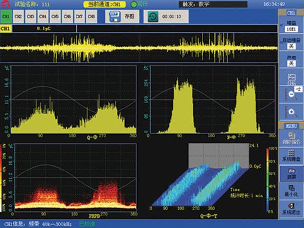 3、具有實時脈沖波形和統(tǒng)計圖譜,既可詳查分析某個相位脈沖,對該脈沖進行頻譜分析,分析放電脈沖的頻譜含量,也可以PRPS、PRPD、Q-N等圖譜進行統(tǒng)計分析;